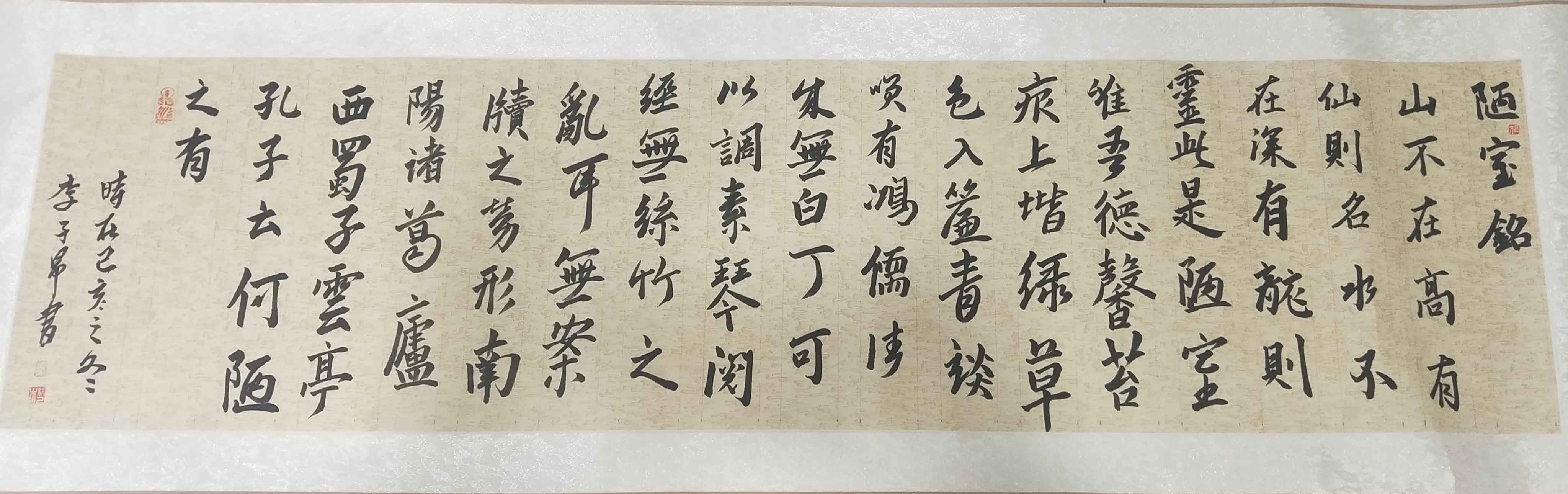 6 书法组 作者信息:李子昂 曲阜市东方学校 13岁 参赛作品名称:陋室铭 作品尺寸:135x32cm 作品点评:削繁就简,变古为今,其用笔不含浑,不故弄玄虚,起笔、运笔、收笔的笔路十分清楚,外貌圆润而筋骨内涵,其点画华滋遒劲,结体宽绰秀美,点画之间彼引呼应十分紧密。外似柔润而内实坚强,形体端秀而骨架劲挺。