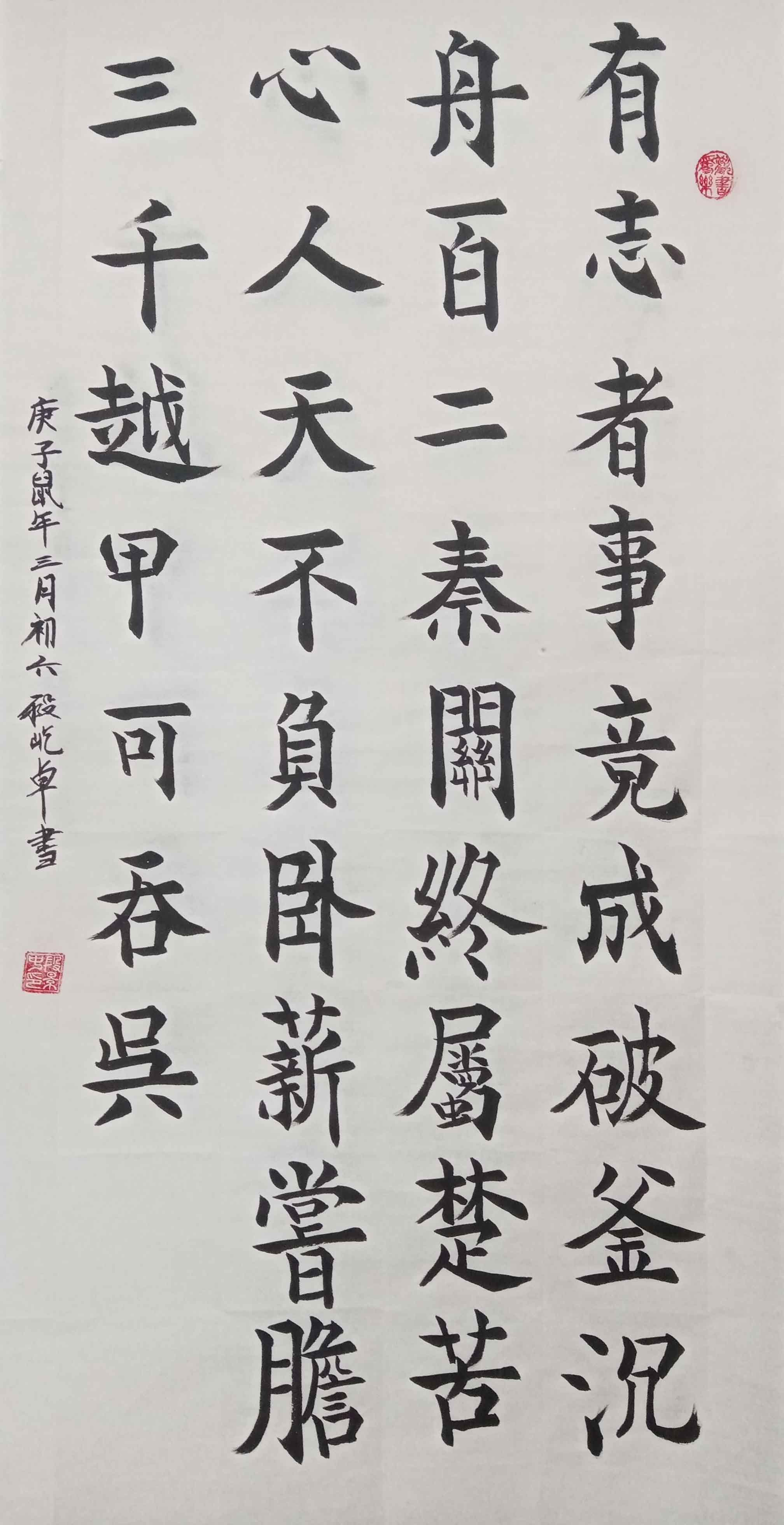 4 书法组 作者信息:段景中 滨州滨城六中 14岁 指导老师:刘树国 参赛作品名称:自勉联 作品尺寸:50x100cm 作品点评:这幅楷书作品,章法完整,气息清和,结构活泼多姿,天真烂漫,富有童趣。用笔如刀,点画明确,厚重。不足处,结构收放不足,略显紧凑。整体字太满,往小去写更显舒朗。