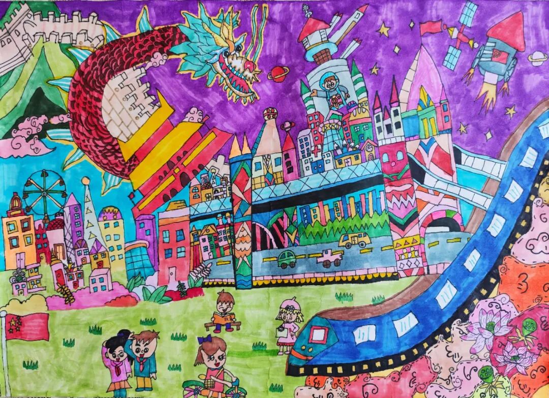 1 美术组 作者信息:周钰淇 济南市历下区弘毅小学 7岁 参赛作品名称:盛世中国 作品尺寸:54×46cm 作品点评:题材非常好,小康致富感谢邓小平给我们人民改善了贫穷的生活,缩小了贫富差距。画中的汽车还有高楼表现了现在人民生活水平的提高,非常之精彩,画中如果出现云朵或太阳,会比较清澈,不会混浊。