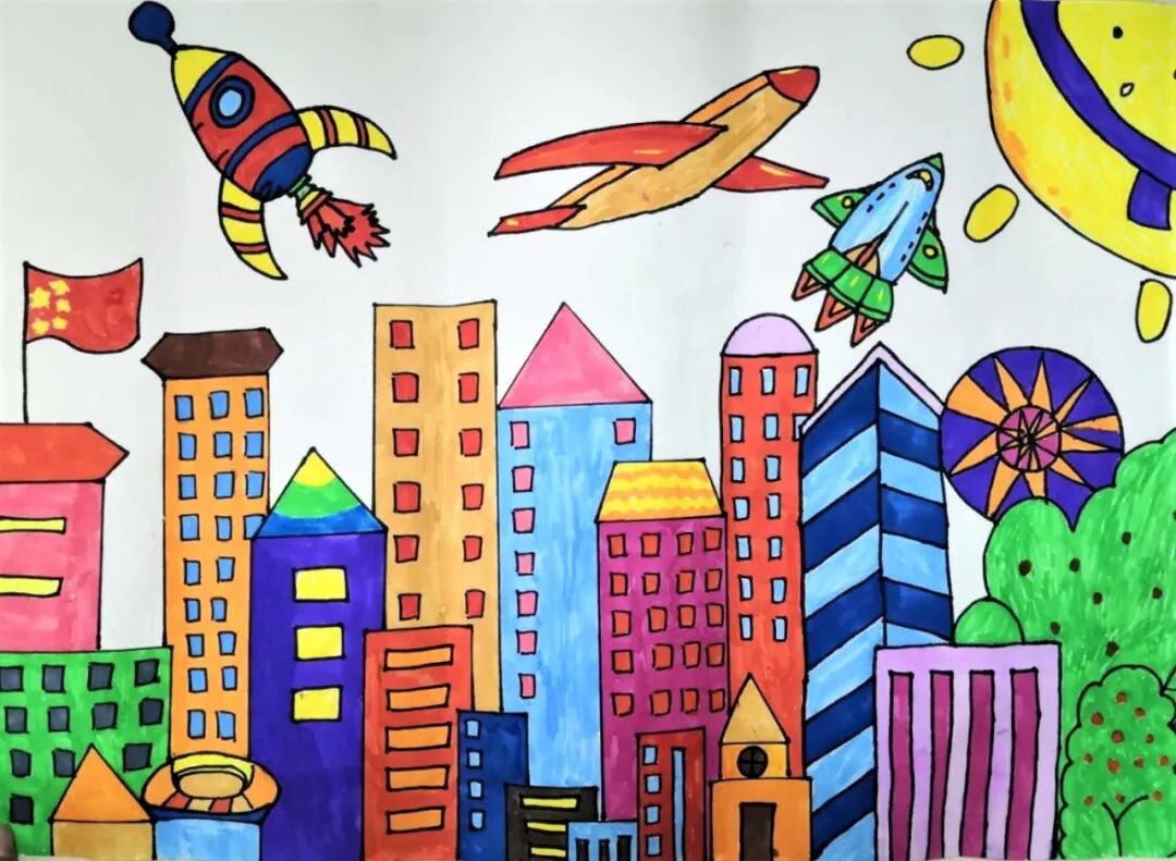 3 美术组 参赛作品名称:朝向幸福的梦想 作品尺寸:54×46cm 4 美术组 作者信息:张伊腾 曲阜东方学校 13岁 参赛作品名称:新时代 作品尺寸:54×46cm 作品点评:画面描绘了中国科技的强大,航天技术取得了重大的成就,这才是我们的新时代。高楼大厦,五星红旗,呈现在我们的面前,让人惊艳不已。色彩搭配艳丽,饱和度高,非常优秀。可以再画点人物,更能烘托气氛和那种氛围,整体还是相当不错的。
