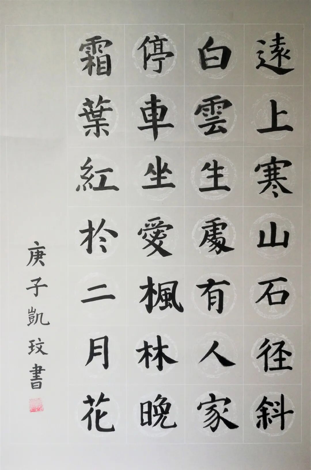 9 书法组 作者信息:邱子涵 长清区石磷小学 12岁 参赛作品名称:黄鹤楼送孟浩然之广陵 作品尺寸:70×44cm 作品点评:整幅作品章法不错,很秀气,看出来基本功比较扎实。可以再加强点画和结构的联系,同时丰富用笔。